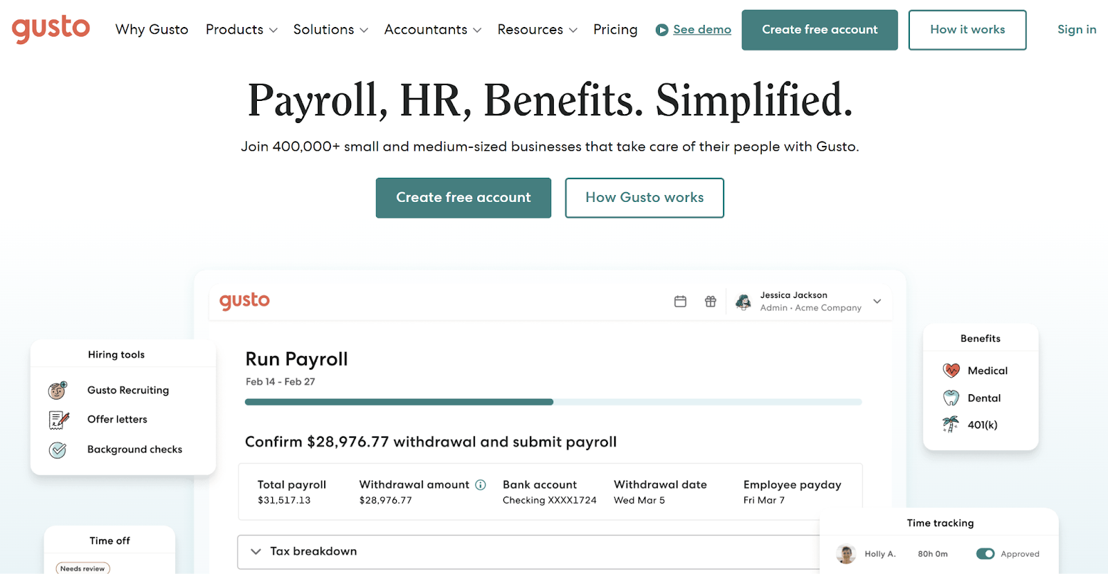 Because of its more basic features, Gusto is primarily used by small businesses looking for a single payroll, benefits, and employee hours tracker.