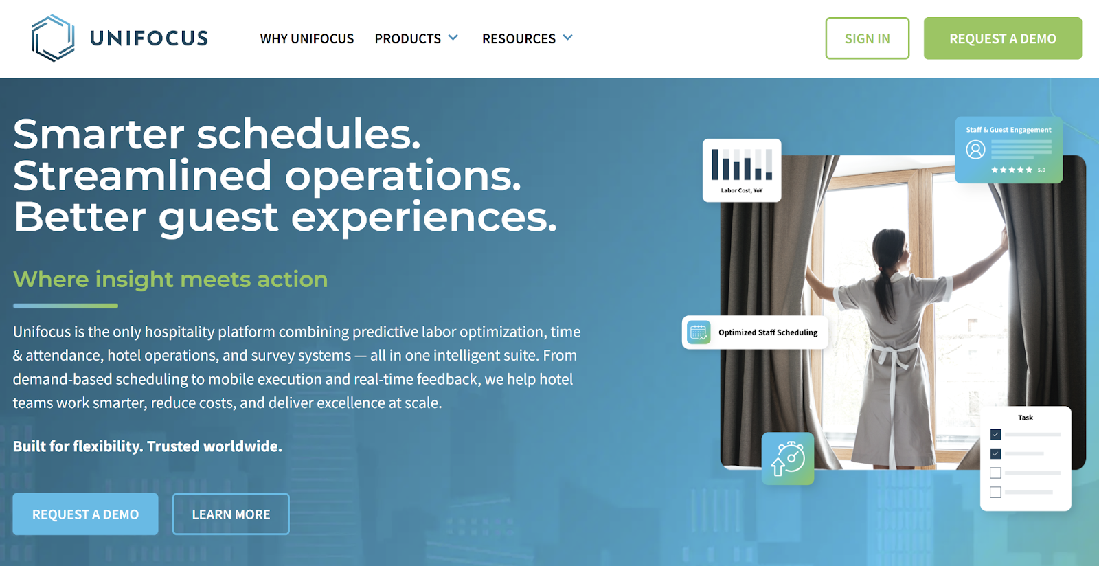 Unifocus is a hospitality platform that combines scheduling with time tracking, survey systems, and analytics. It helps hospitality businesses balance labor costs, compliance, and coverage to simplify scheduling.