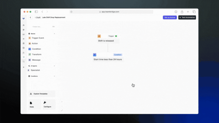 Everyone fears the last-minute shift drop. With Automation Engine, you quickly set up a workflow to activate an AI agent (more on this in a moment) to fill the shift automatically whenever there’s a last-minute drop or no show.