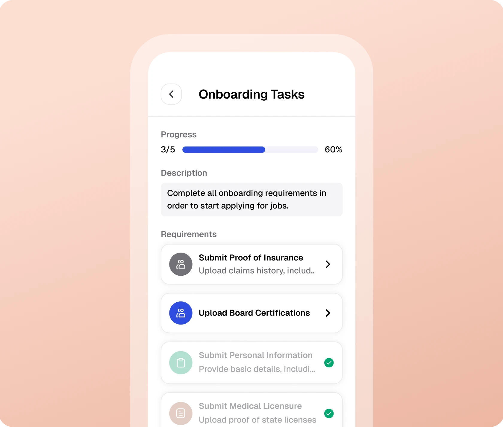 - Empower doctors to complete onboarding, apply for jobs, book travel, clock in, and more, all from their phone