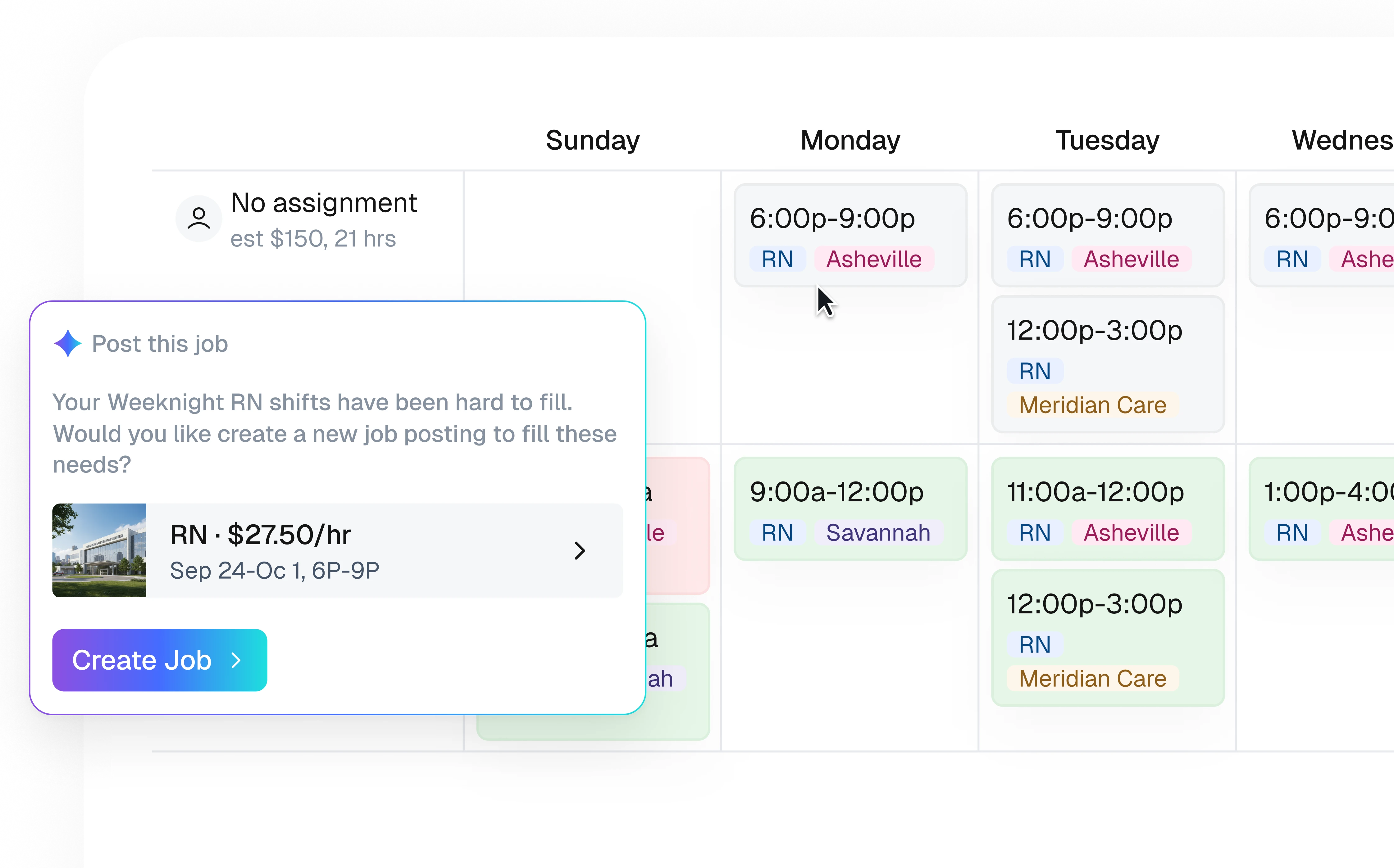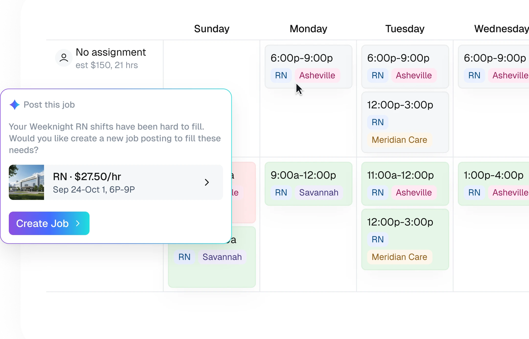 Create job postings based on your scheduling gaps or upcoming demand. Post them in one click.