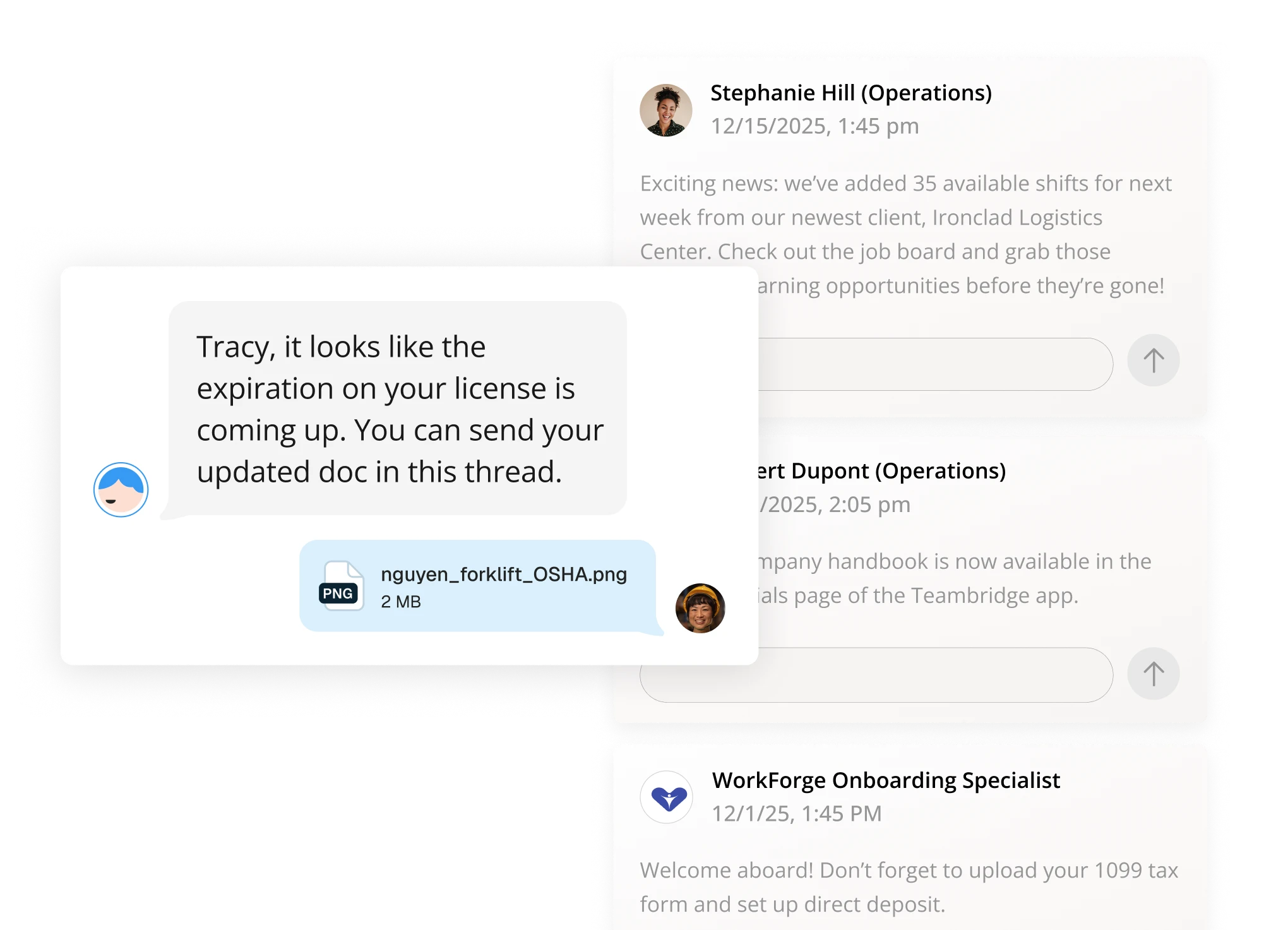 Omnichannel chat integrates multiple communication channels, like email, SMS, and in-app notifications, in one unified experience. Omnichannel chat allows businesses greater flexibility and consistency when connecting with workers whose environments, devices, and workflows may differ.