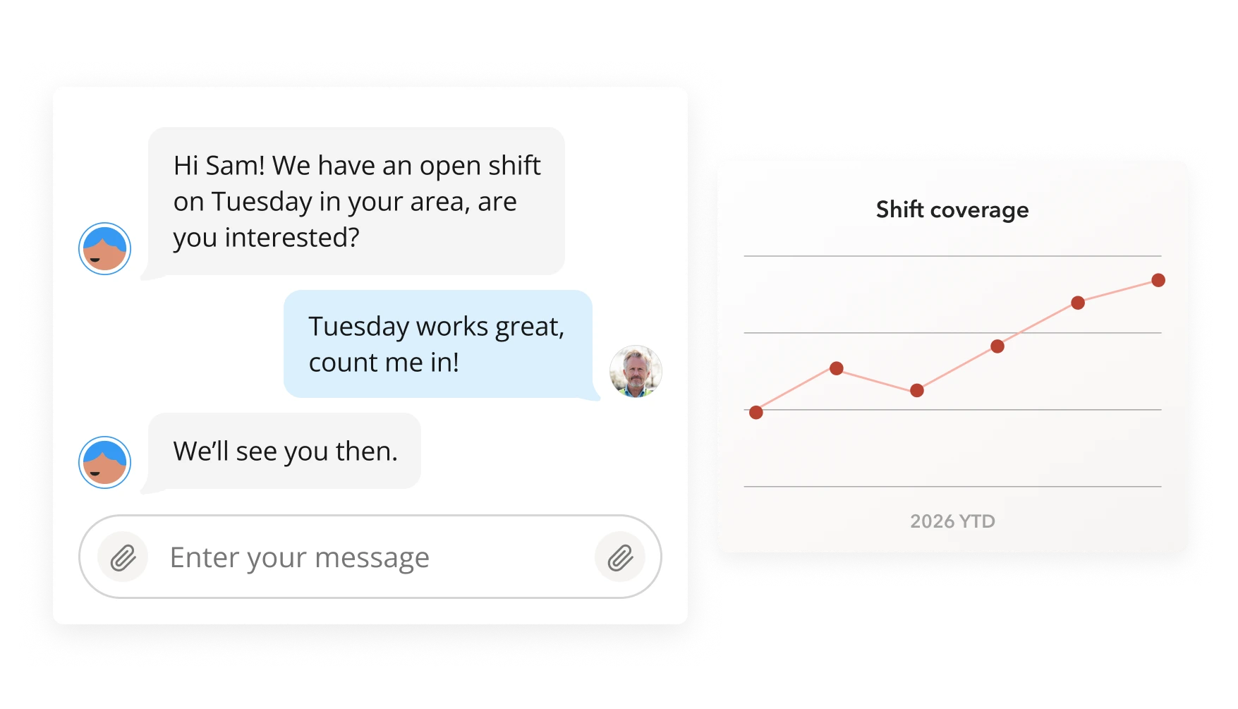 Send reminders, shift invites, and other messages triggered by any data in Teambridge. Let AI Specialists handle two-way communication with staff and clients across channels, keeping responses fast, reliable, and on-brand.