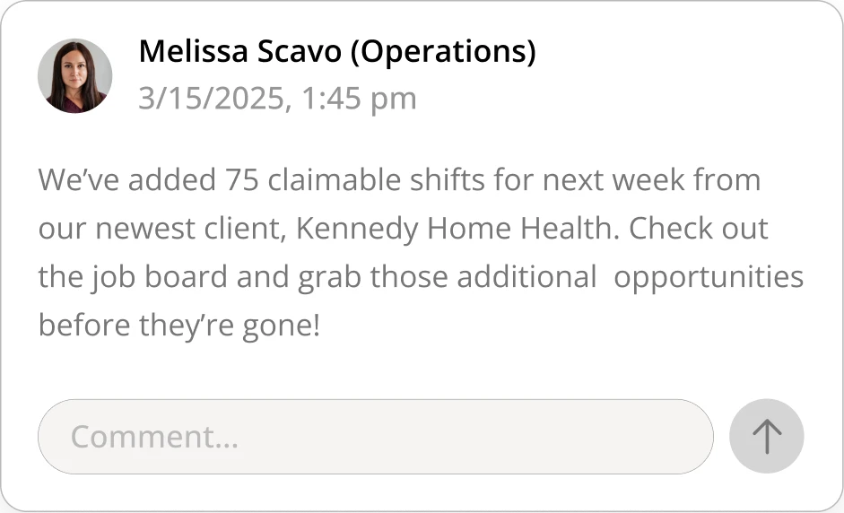 Clear, personal interactions keep staff engaged and quick to respond, improving reply rates, shift acceptance, and speed to onboarding completion. Deep links and record previews make it easy for staff to take action the moment they open a message.